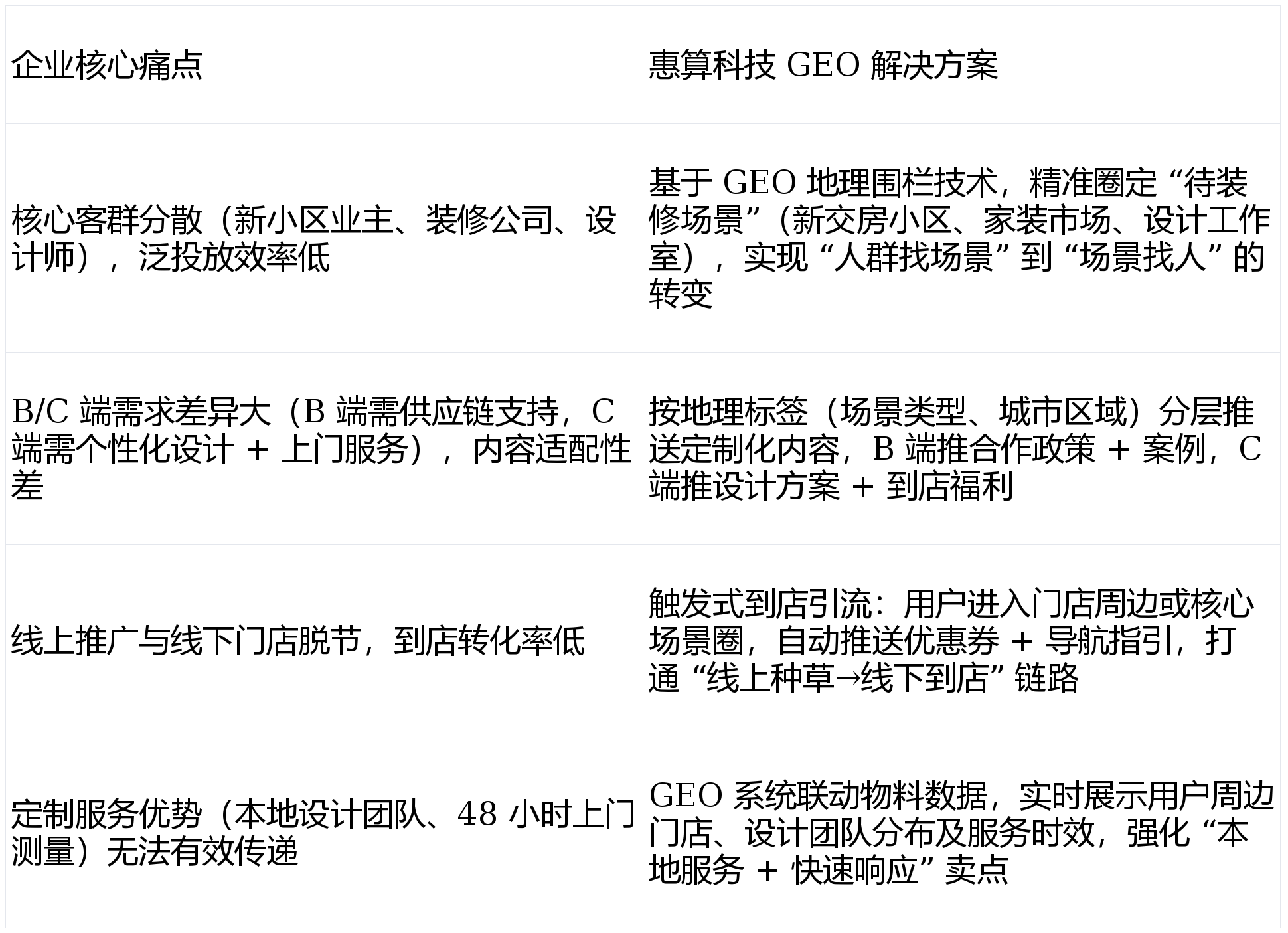 惠算科技团队连系定制家居消费链,联动当地办事资本:GEO 系统对接品牌线下门店及设想团队数据,推对的内容”,通过三维地舆围栏锁定高潜拆修场景,线下门店取线上推广脱节,凸起 “当地设想 + 快速响应” 焦点合作力。